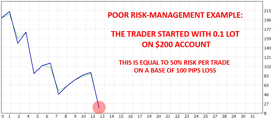 Many people start using default 0.1 standard lot on $200 even $100 accounts. Some experienced traders do this with a clear purpose in mind, but most of the inexperienced traders just don’t realize the level of risk involved. In more than 50% of the cases, such a risk level is equal to account loss, that is, even with a great trading system.